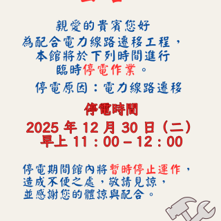 停電期間館內部分設備將暫時停止運作,造成不便之處,敬請見諒。